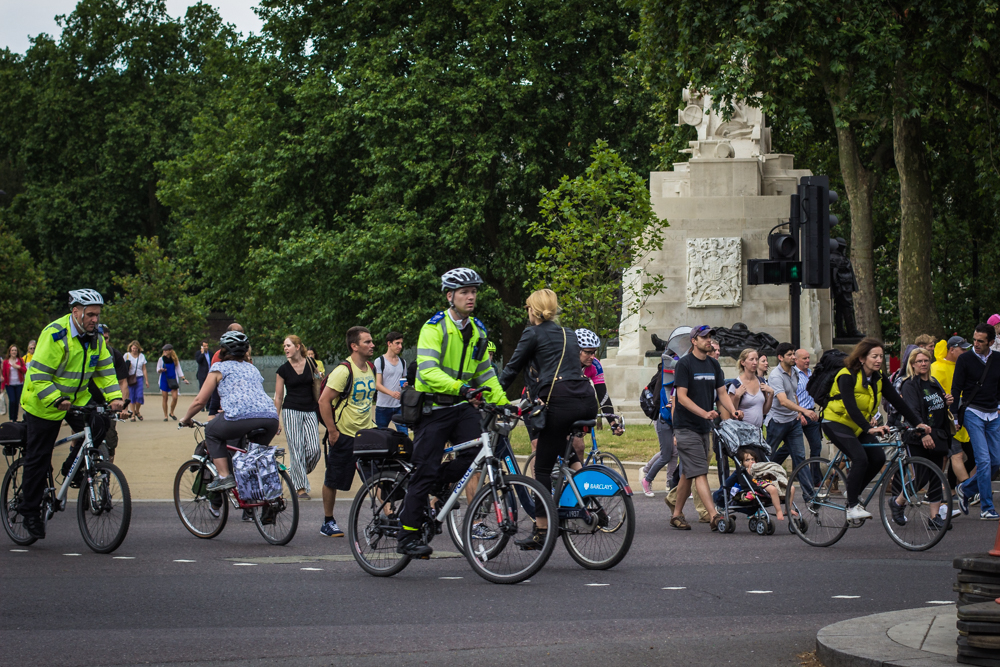 In my photo the police are not exactly setting a good example. I’m guessing they’ve forgotten what they were taught on their public safety cycling course.