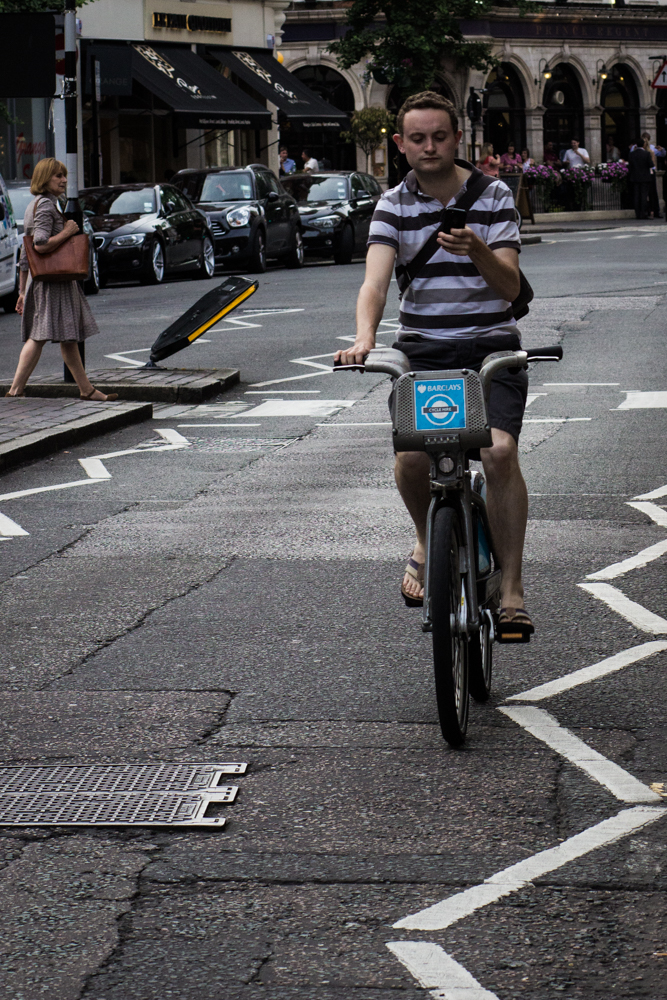 The next cycle lane is also occupied by a pedestrian. The pavement to her left was empty yet she decided to walk in the cycle lane and again appeared oblivious that it is a contraflow lane with motor vehicles approaching her from the front and cyclist coming from behind. Inconsiderate, stupid or just thoughtless? She is the sort that wonders around the West-end and Covent Garden like it is a pedestrian zone. You know what; as a road user in/on private or public transport, you’re the type of person holding me up.
